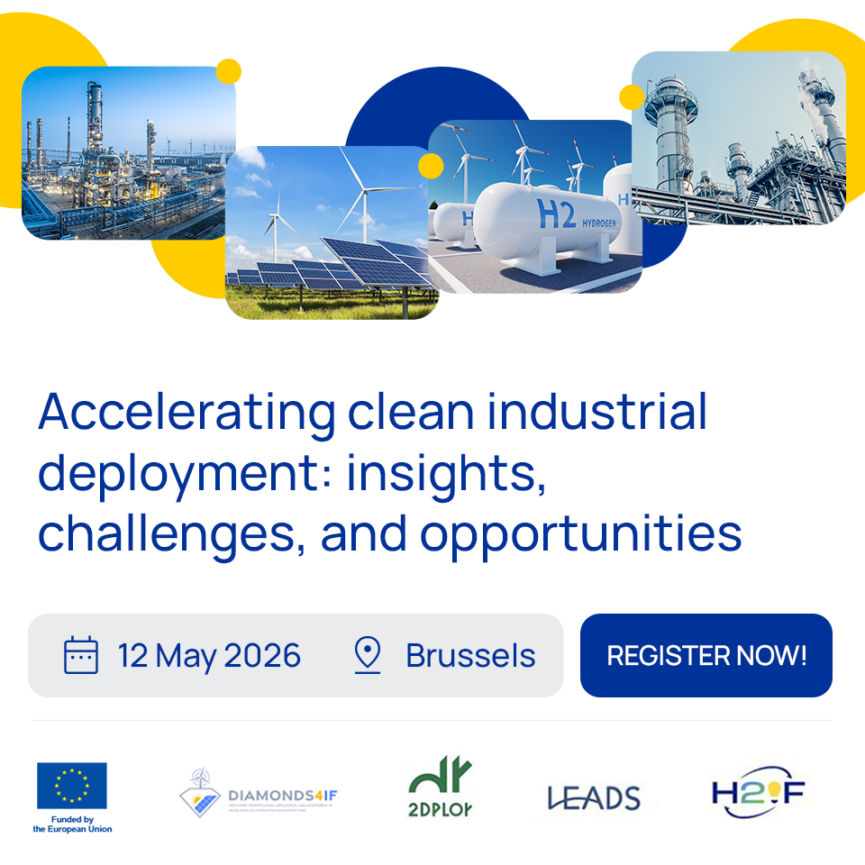 The EU-funded projects DIAMONDS4IF, LEADS, H2IF, 2DPLOY, in close collaboration with CINEA, DG CLIMA and DG RTD and with the support of REALIZE, are pleased to invite industrial representatives to the public event: Accelerating clean industrial deployment: insights, challenges, and opportunities. The event will focus on defining and sharing a strategic vision for European industrial decarbonisation and the effective deployment of innovation. It aims is […]